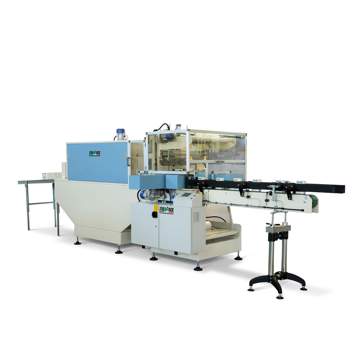Ogni fase è studiata per assicurare che il confezionamento e la termoretrazione non alterino in alcun modo l’integrità dei pacchetti o del contenuto. La fardellatrice Italpack si compone di tre sezioni principali: